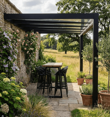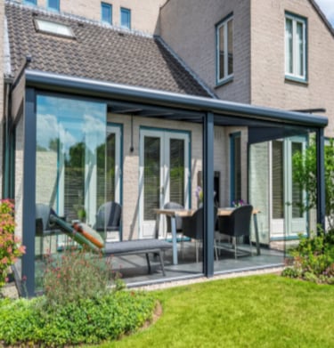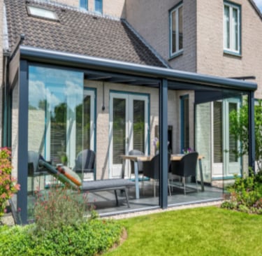 Our stylish flat-roofed veranda featuring a modern cubist design, specially engineered for bungalows and properties requiring a low-level attachment.